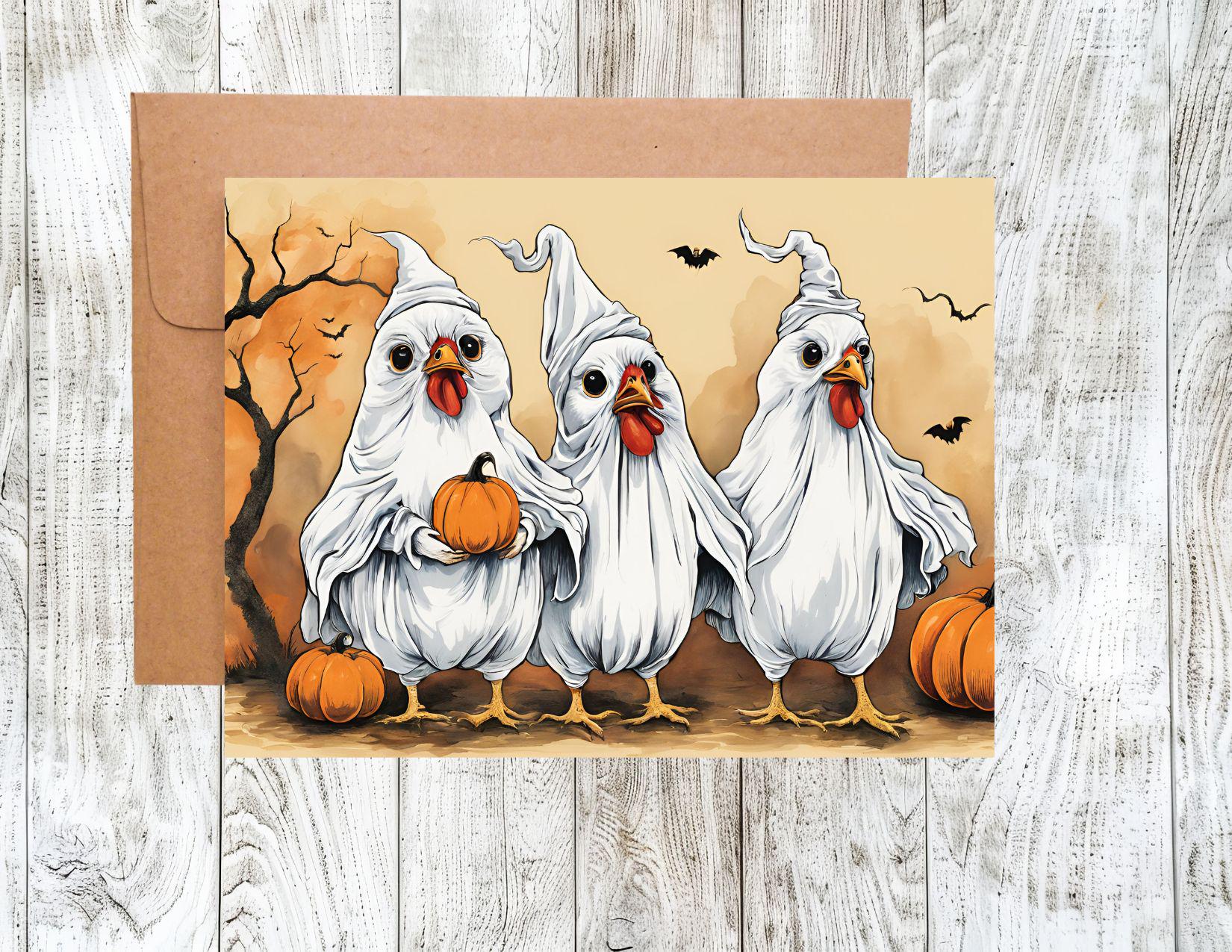 Add a touch of humor and whimsy to your Halloween greetings with these delightful cards featuring a trio of chickens dressed up as spooky ghosts! Perfect for sending to friends, family, or anyone who loves a fun twist on Halloween traditions. Each card is blank inside, giving you plenty of room for your personalized message. These charming and unique cards are sure to bring a smile to anyone’s face this spooky season!