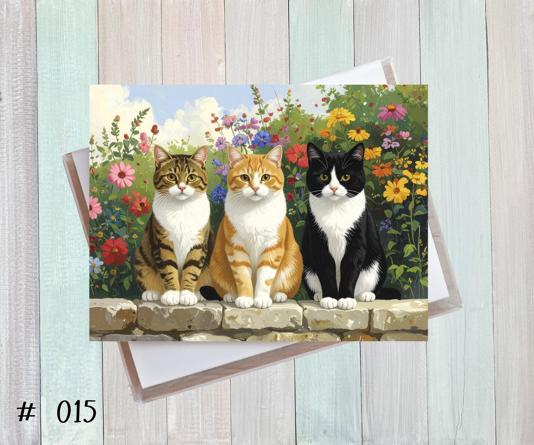 This charming notecard features three cats on the garden wall, among vibrant flowers. Perfect for cat lovers and nature enthusiasts alike, this card is ideal for any occasion—whether it's a birthday, thank you, or just because! The interior is blank, allowing you to personalize your message. Printed on high-quality cardstock, this card is ready to bring a smile to your recipient's face. Great for gifting or as part of your stationery collection.