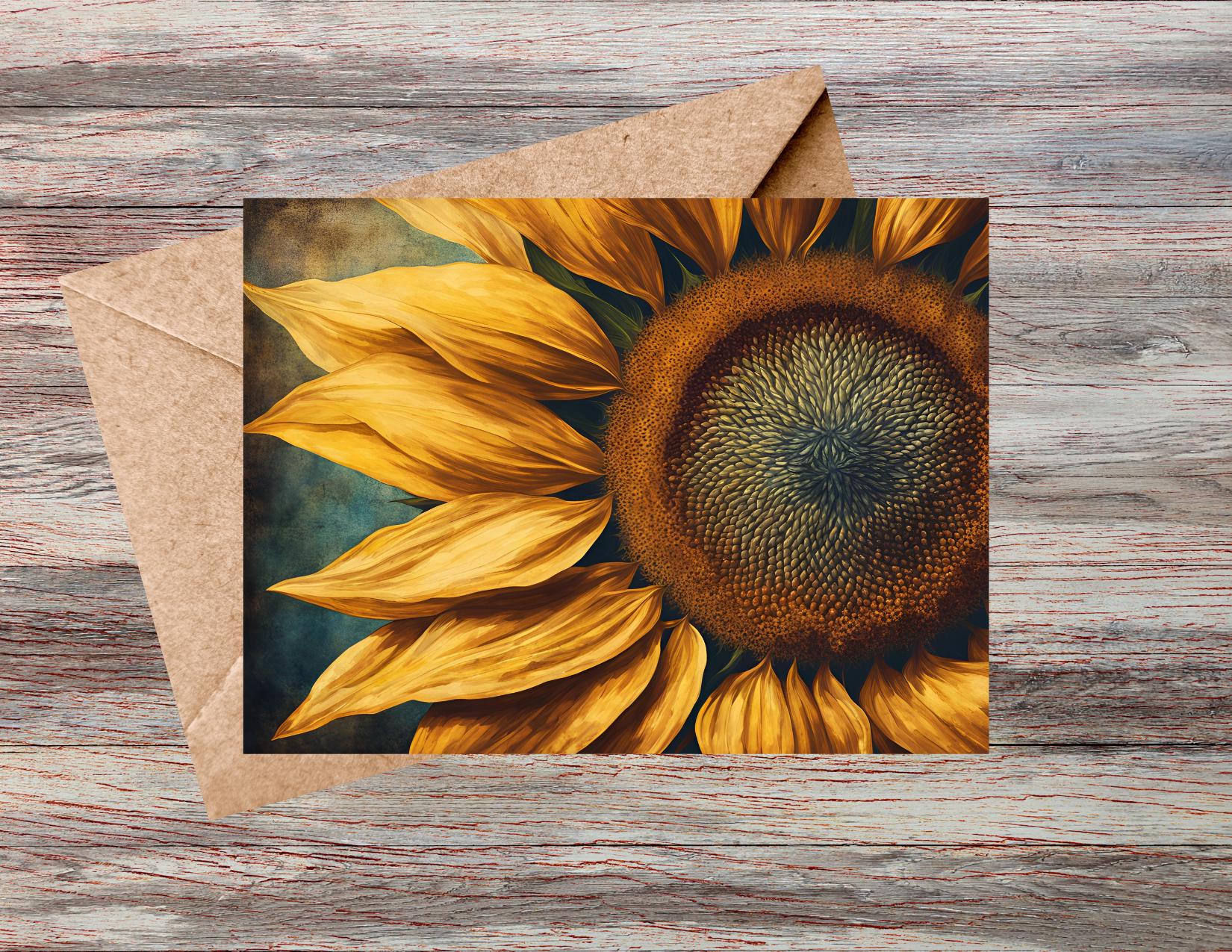 Brighten someone's day with this stunning set of notecards featuring a close-up image of a giant sunflower. Perfect for any occasion, these handmade cards capture the intricate beauty of a sunflower and bring a touch of nature’s warmth to your messages. Whether used for thank-you, thoughtful notes, or just-because messages, these blank cards allow for your personal touch inside.