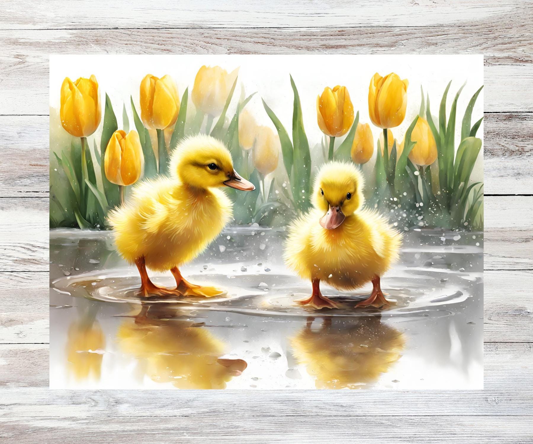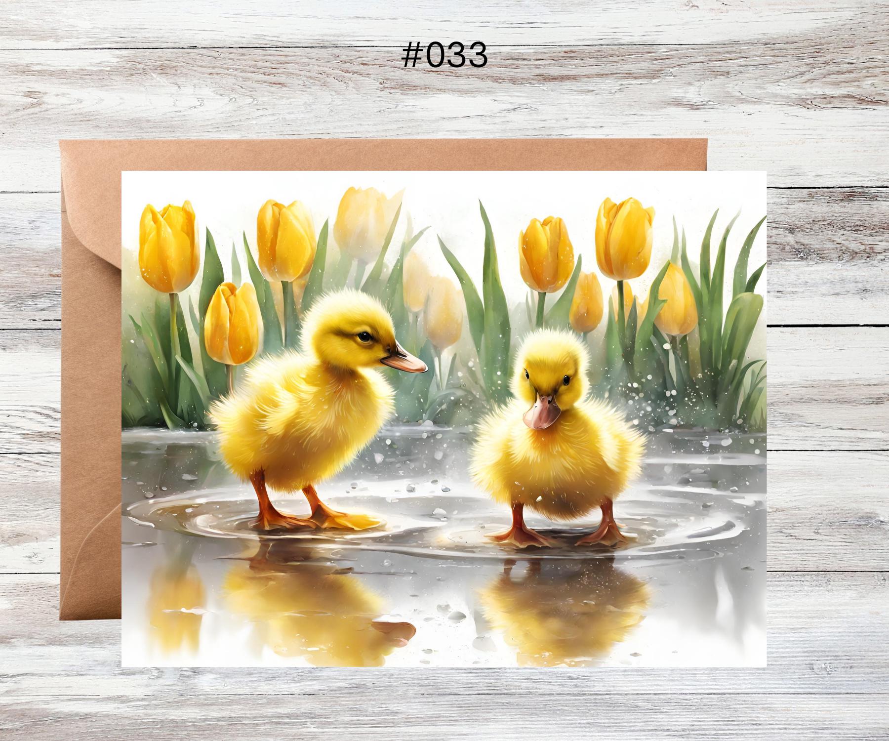 Send a splash of sweetness with this adorable blank notecard featuring two yellow ducklings playing in a puddle, making it a delightful choice for animal lovers and nature enthusiasts.