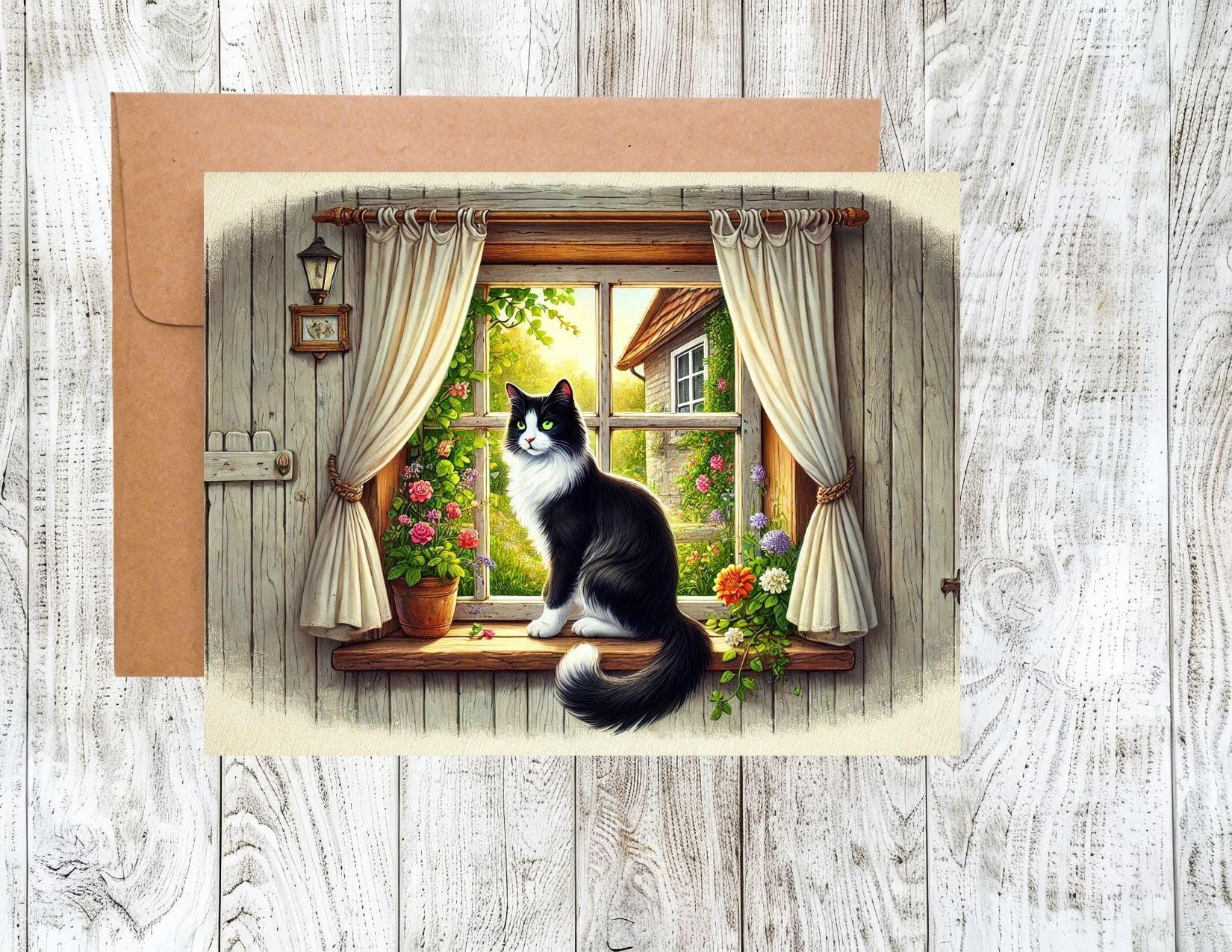 This card features a handsome tuxedo cat sitting in a country cottage window. Whether you're sending a thoughtful note or just want to add a touch of whimsy to your stationery collection, this card is perfect for any occasion.