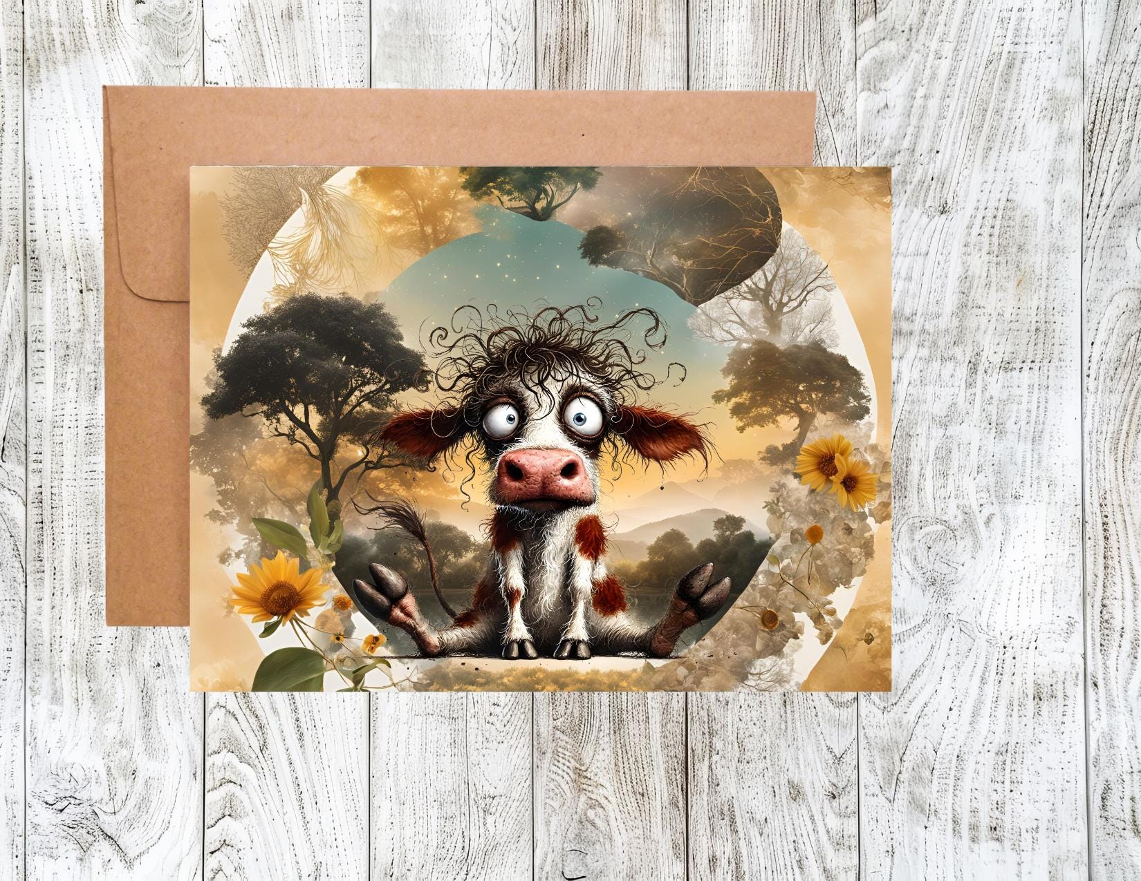 Bring a smile to someone’s face with this charming blank notecard featuring a delightfully frazzled cow plopped right in the middle of a fantasy garden circle. With wild hair, wide eyes, and just the right amount of garden chaos, this quirky cow is the perfect pick-me-up for anyone who’s ever had “one of those days.
