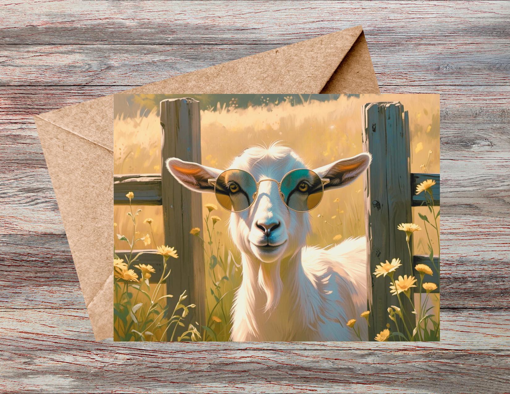 Add a dose of charm and humor to your correspondence with this one-of-a-kind notecard featuring a quirky doe goat rocking a pair of sunglasses! Perfect for sending a quick hello, a thank-you, or just a little surprise to brighten someone’s day, this blank notecard suits any occasion. Great for animal lovers, farmers-at-heart, goat lovers, or anyone who appreciates fun and artistic stationery.