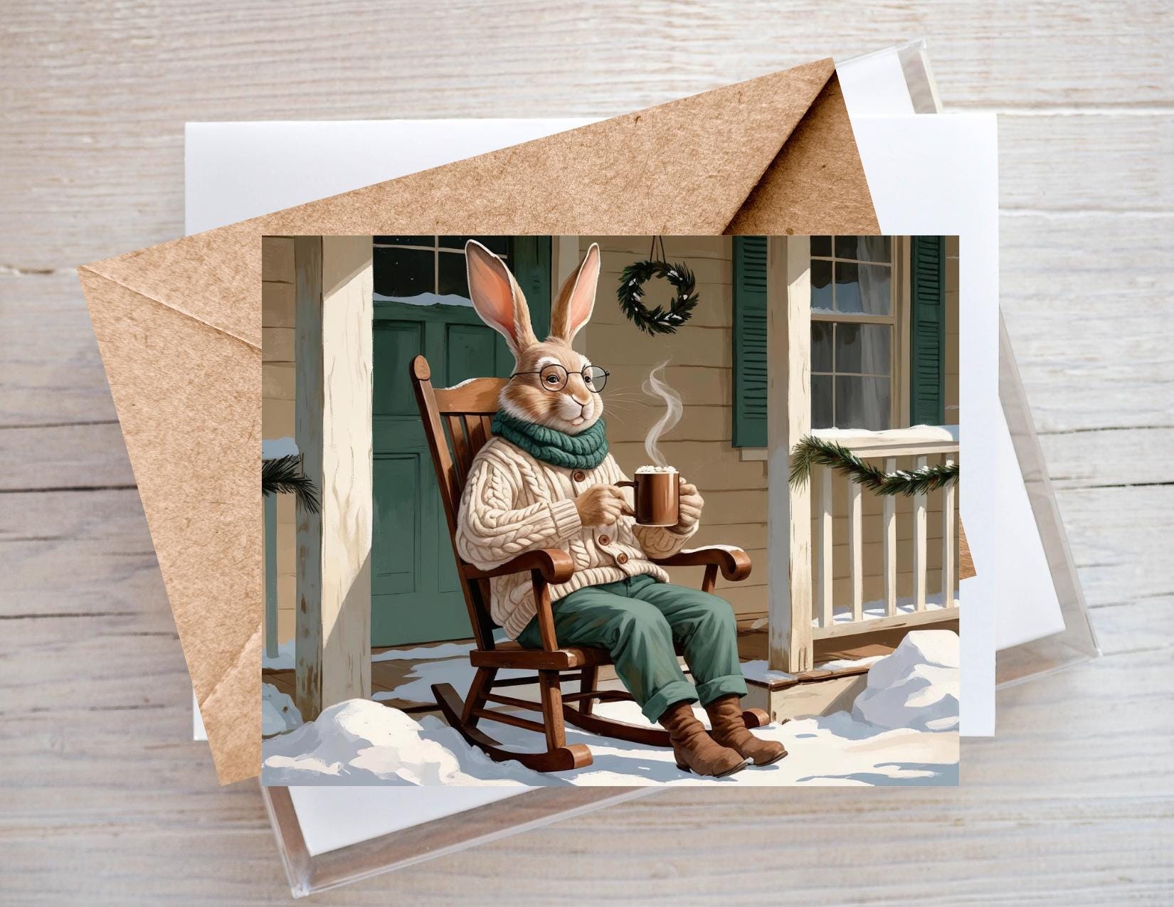 A cozy storybook-style notecard featuring grandpa bunny in a rocking chair with hot chocolate. Blank inside—perfect for birthdays, thank yous, or just because! Bring a touch of cozy storybook charm to your correspondence with this whimsical notecard. The inside is left blank so you can add your own heartfelt message, making it versatile for everyday notes or special occasions.