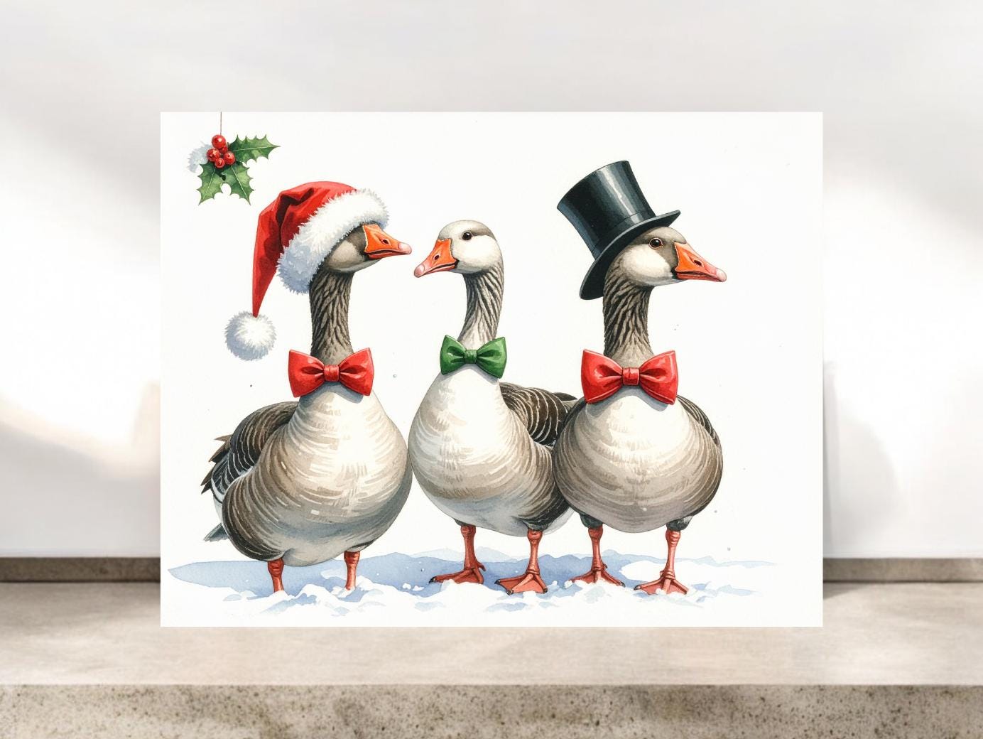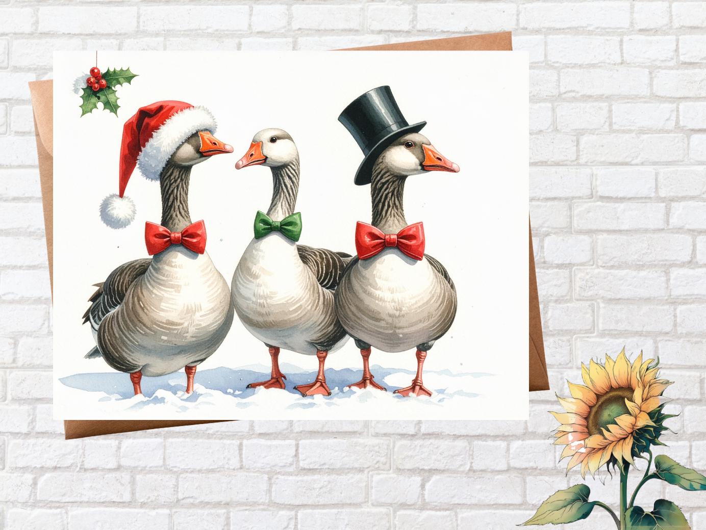 Whimsical Christmas geese notecards, perfect for sending holiday greetings or use them as party invitations. The inside is blank, giving you plenty of space for your personal message.