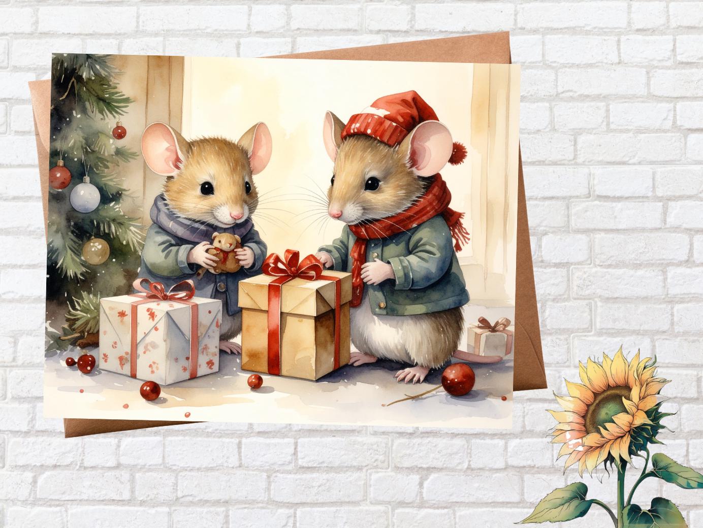 Whimsical Christmas mice wrapping presents - holiday notecards, perfect for sending holiday greetings or use them as party invitations. The inside is blank, giving you plenty of space for your personal message.