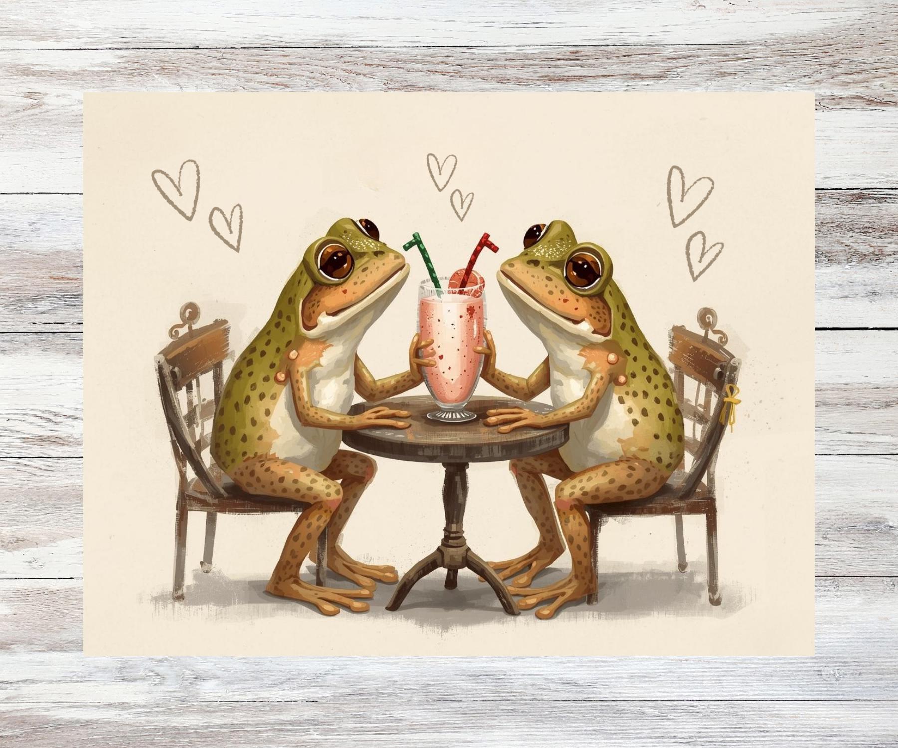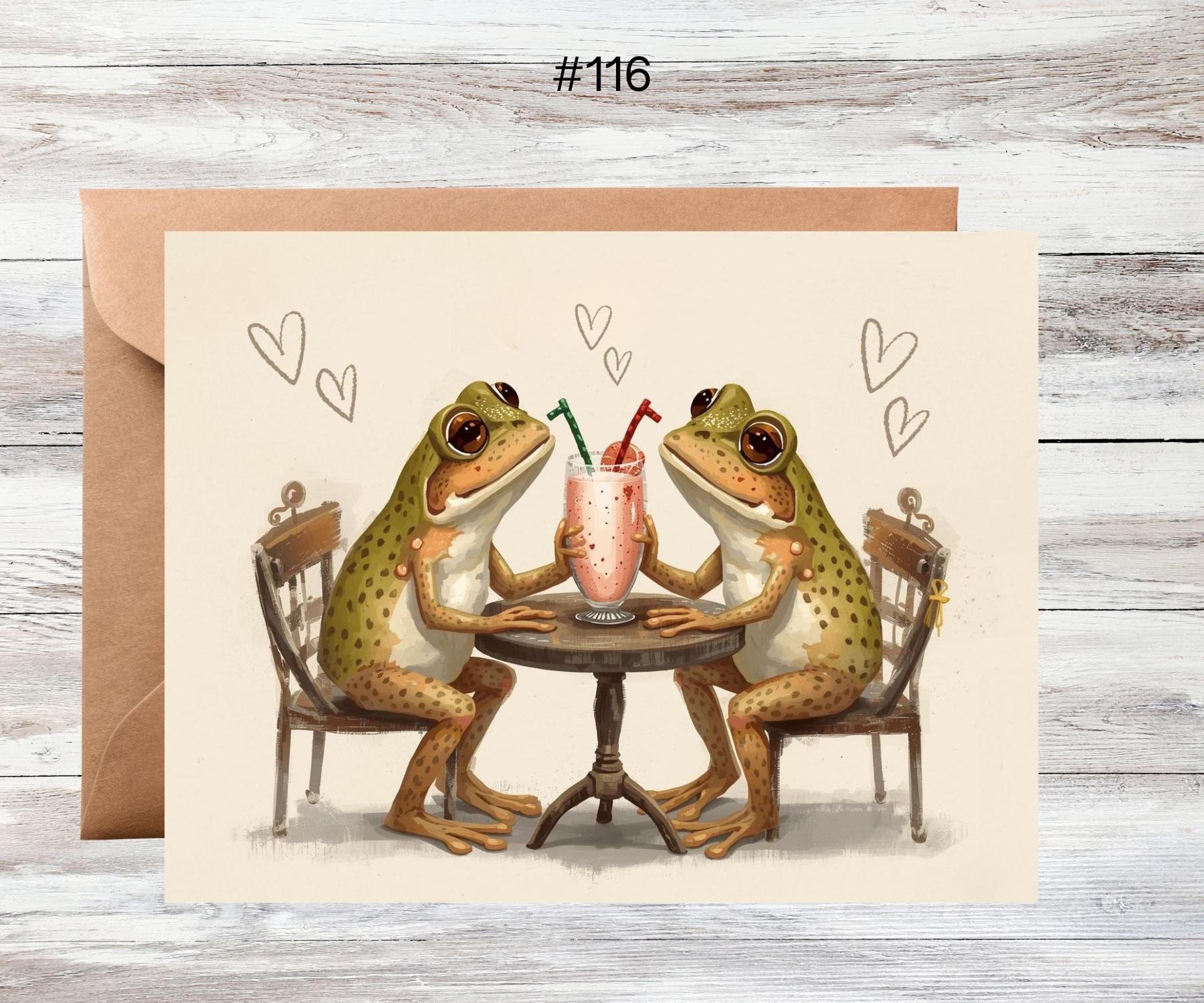 This printed greeting card featuring two whimsical frogs sharing a moment makes a great Valentine, or simply a card to use when sending a note to someone you care about.