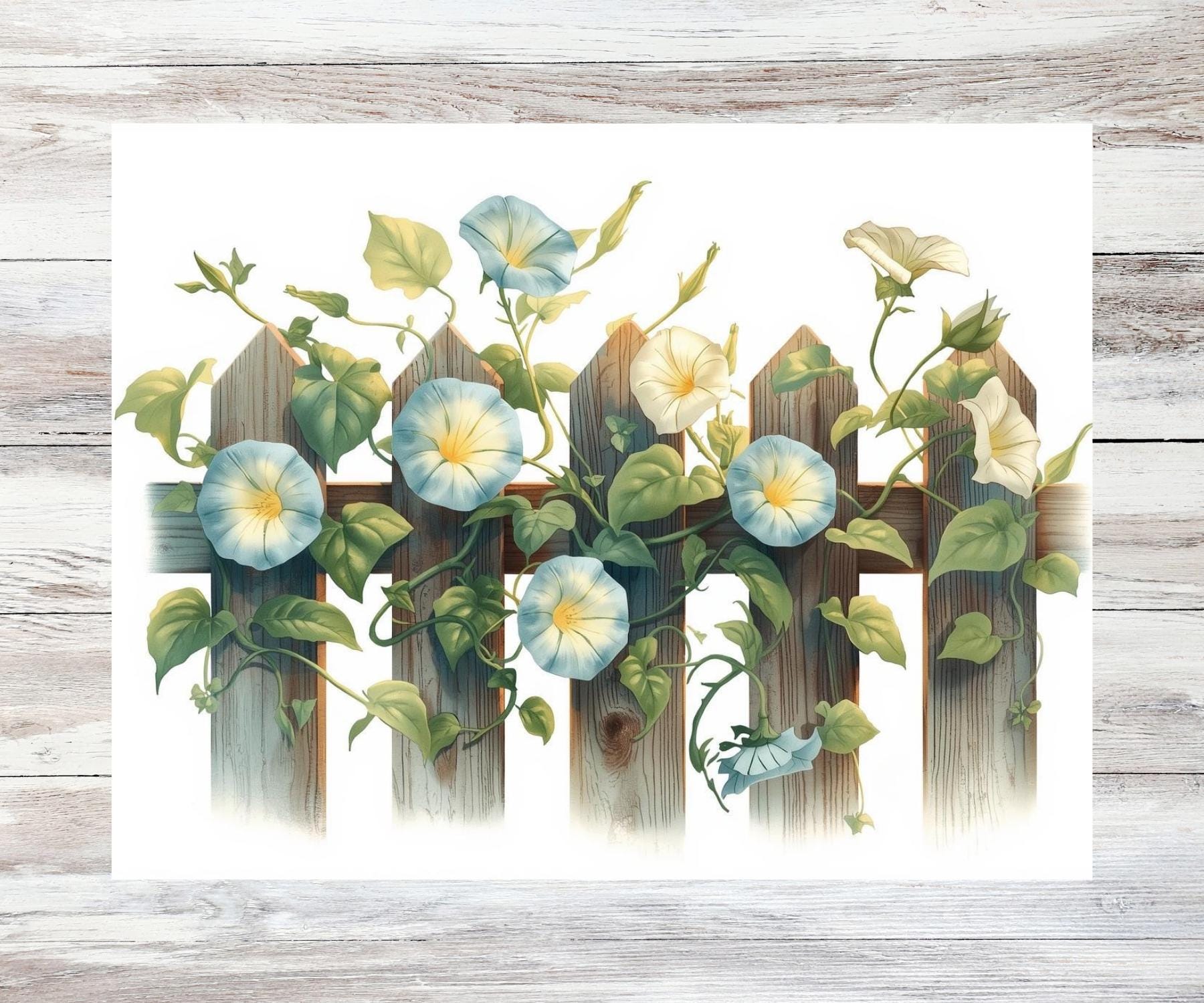 This printed greeting card featuring morning glory flowers growing on a wood fence makes a great card for any occasion.